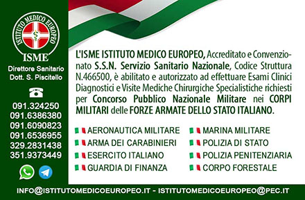 Sono il Dottore Salvatore Piscitello, Direttore Sanitario dell’ISME Istituto Medico Europeo,Poliambulatorio Medico Chirurgico Specialistico,Accreditato e Convenzionato con il Servizio Sanitario Nazionale,con Codice Struttura Regionale Numero 466500,abilitato e autorizzato ad effettuare Esami Clinici Diagnostici e Visite Mediche Chirurgiche Specialistiche richiesti per Concorso Pubblico Nazionale Militare nelle FORZE ARMATE ITALIANE, pertanto si certifica che l’ISME ISTITUTO MEDICO EUROPEO è autorizzato a svolgere attività mediche chirurgiche specialistiche ed equiparato a tutti gli effetti di legge al Servizio Sanitario Pubblico Nazionale.