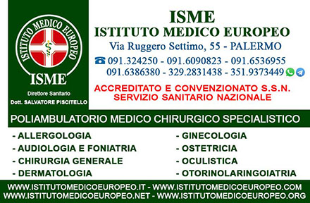 L'ISME - Istituto Medico Europeo di Via Ruggero Settimo 55, sito nel cuore della città di Palermo a due passi dal Teatro Massimo e dalla Piazza Castelnuovo, e L'ISME - Istituto Medico Europeo di Via Ignazio Galletti 128 D/E/F Palermo, vantano la presenza di figure mediche esperte e dalla comprovata esperienza nel settore delle attività medico chirurgico ambulatoriale coadiuvate dalle apparecchiature medicali all'avanguardia e di ultima generazione tecnologica.